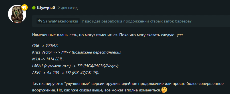 Я помню в игре была планка позволяющая вешать отечественные прицелы на планки пикатинни, мож добавим ради рофла? Да и в целом хотелось бы видеть больше прицелов под ласточкин хвост.